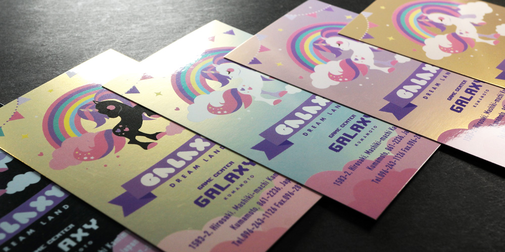 不思議な世界をイメージして作られたパステル系メタル紙「おとぎのくに」シリーズを使った名刺です。全5種類の用紙×3種類のPPのバリエーションから選択可能です。印刷はフルカラー+白印刷で、表面処理はクリアPP・マットPP・グリッターPPから選択可能で、PPの種類により全く違った雰囲気に仕上がります。